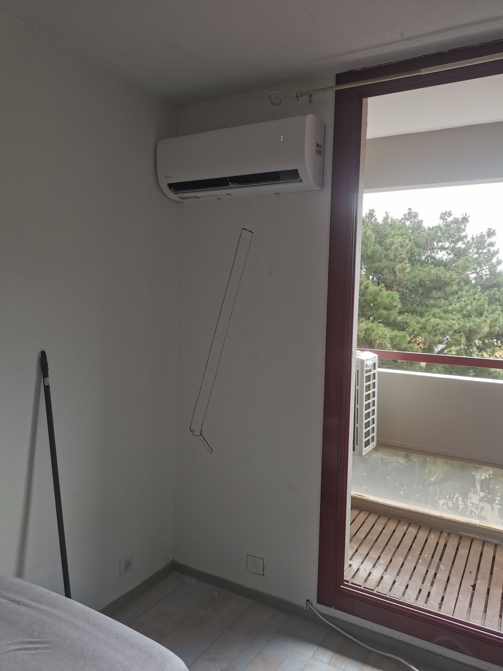 Installation d’une climatisation de 2,5 kW neuve comprenant cuivre support de fixation câbles d'alimentation et liaisons carottage tirage au vide mise en service.
